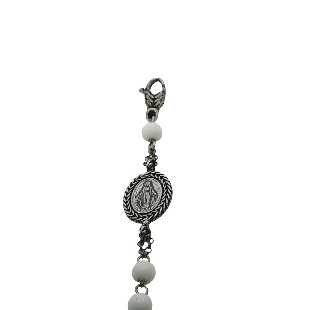 Il bracciale BELLEZZA SPIRITUALE è strutturato a rosario in argento con perle sferiche in AGATA lucida. Il design include una medaglietta ovale con l’effigie della Madonna finemente lavorata e una croce laterale con dettagli texturizzati. La montatura a catena unisce simmetria e precisione artigianale per un gioiello dallo stile classico e spirituale.
