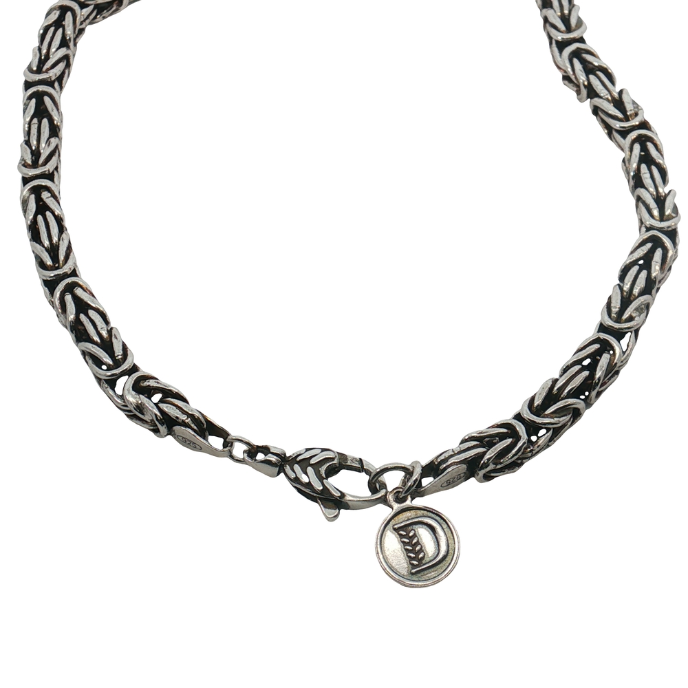La collana Bizantina in argento 925 brunito è l’ideale per essere alla moda. La catena all’estremità ha una chiusura a moschettone decorato con la nostra iconica “D”.