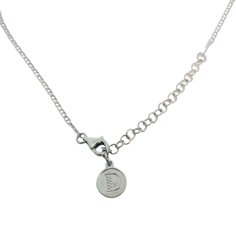 Una raffinata collana in argento composta da una sottile catena a maglie classiche e un pendente a forma di bandiera con un elegante fondo blu con bordi dorati e un decoro grafico centrale, perfetto per un look casual ma distintivo. La finitura lucida garantisce un’ottima simmetria e brillantezza complessiva.