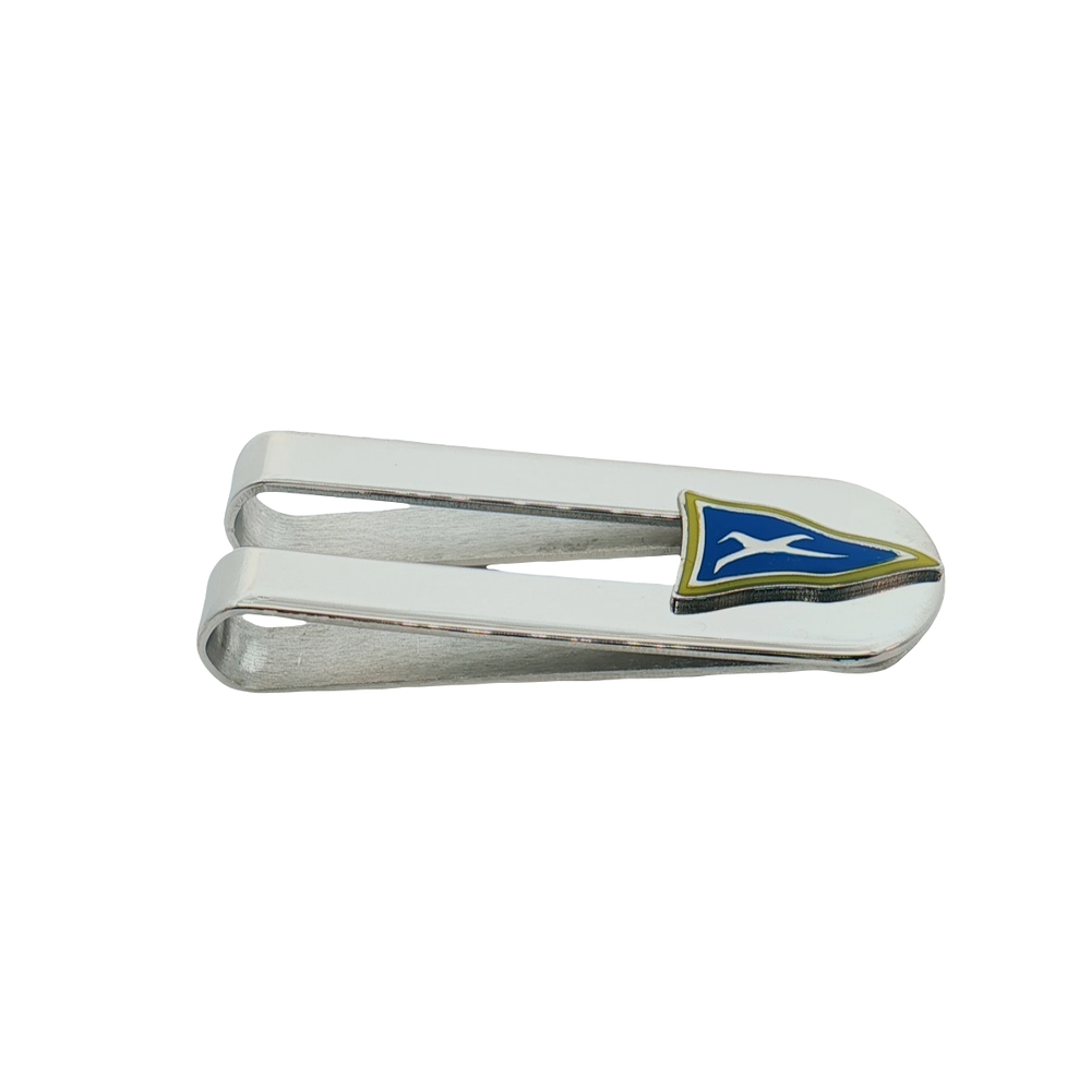 Elegante fermasoldi in metallo lucido con finitura argentata a specchio. Il design arrotondato è impreziosito da un inserto smaltato a forma di guidone, caratterizzato da un vivace sfondo blu e profili in giallo/oro. Un accessorio raffinato e funzionale per l’uomo contemporaneo.