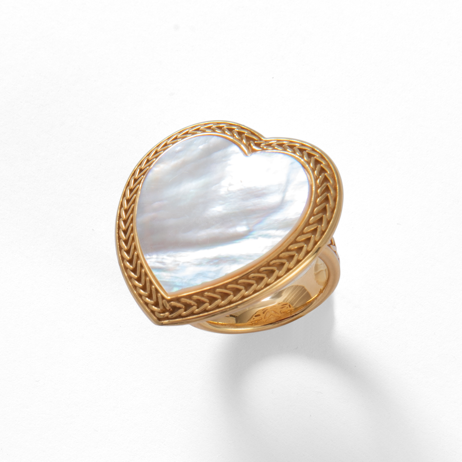 L’Anello Cuore Madreperla dorato racchiude nella forma a cuore il desiderio e il sentimento dell’amore: la madreperla è custodita dall’argento dorato decorato con l’iconico motivo a spiga di grano, simbolo della collezione Tesoro.