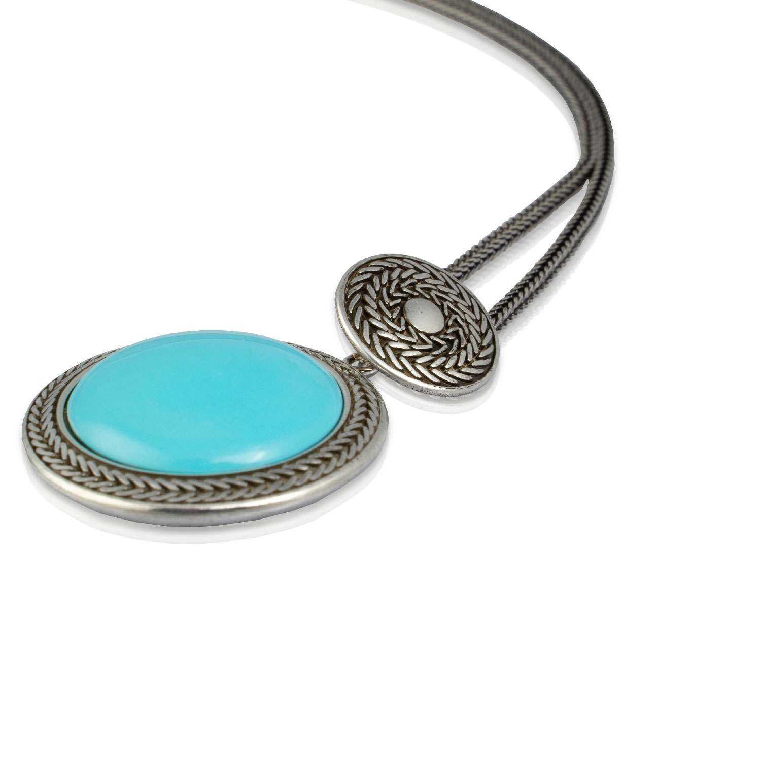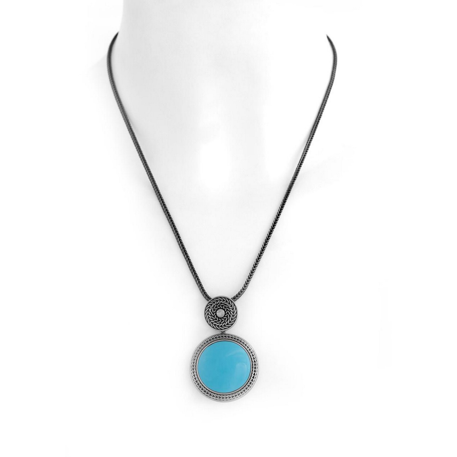 La collana Bellezza Turchese in argento 925 brunito custodisce nel ciondolo una lucente pietra in pasta di turchese, decorato esternamente dall’iconico motivo a spiga di grano, simbolo indissolubile dell’operosità, l’abbondanza e la speranza per il futuro. Il pendente è unito alla collana grazie ad un ciondolo che raffigura un’aspirale concentrica di spighe di grano. La collana pendente è formata da una catena a spiga di grano chiusa all’estremità con chiusura a moschettone.