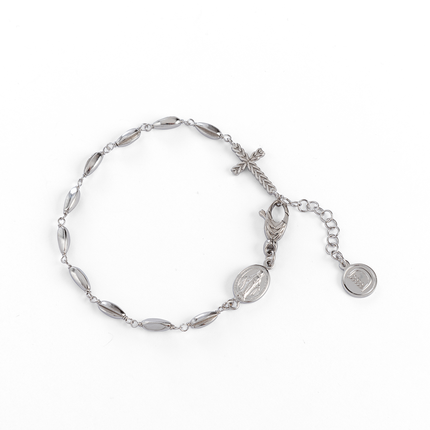 Il bracciale Chicco Spirituale è formato da una serie di chicchi di grano argentati, quest’ultimi sono arricchiti da una croce in argento decorata con l’iconico motivo a spiga di grano, simbolo indissolubile dell’operosità, abbondanza e la speranza per il futuro.