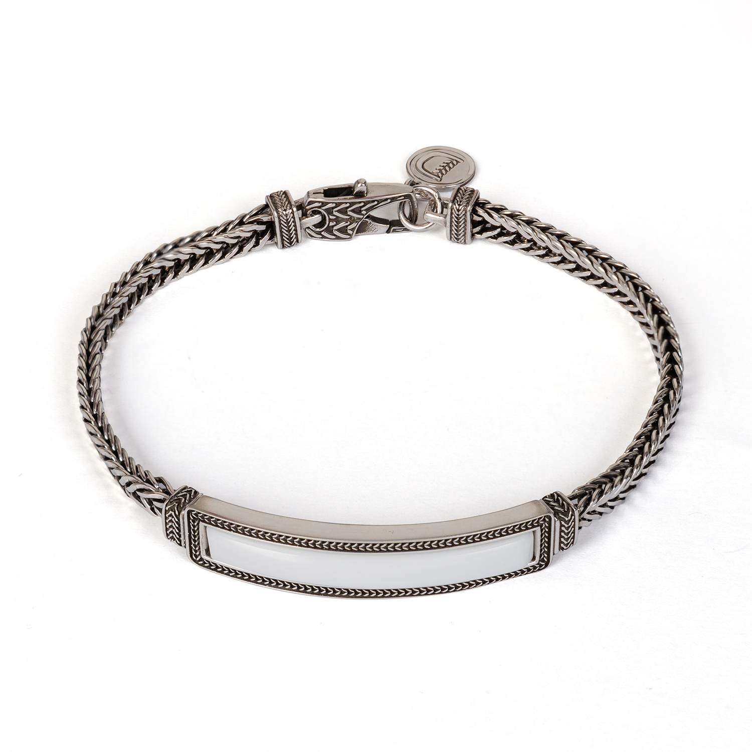 Il bracciale Tratto d’Agata in argento racchiude la pietra d’agata simbolo di purezza e eleganza. Il modello trae ispirazione dagli anelli indossati anticamente dai membri di nobili casati e famiglie. La pietra d’agata bianca, incastonata al centro di un giro di spighe di grano, si erge risplendendo in tutta la sua regale eleganza.