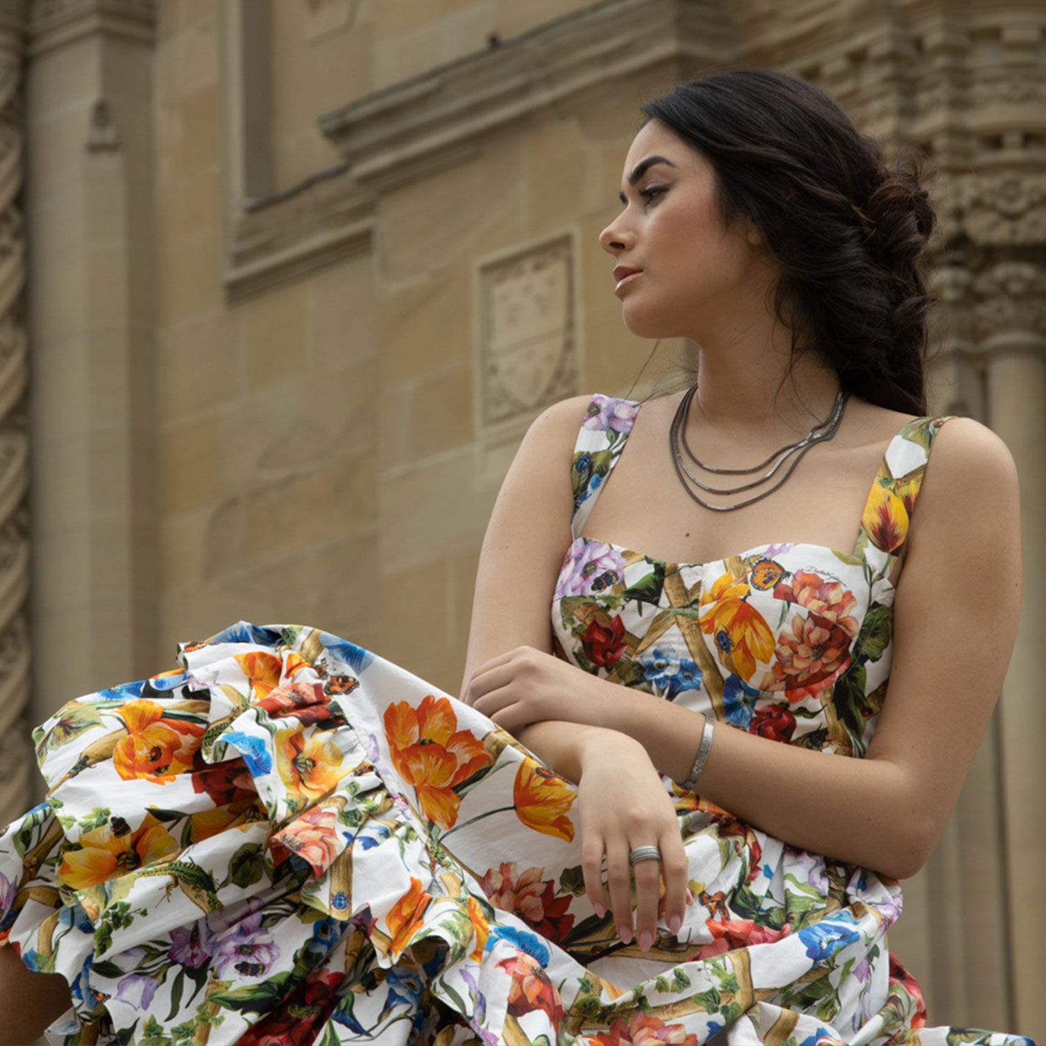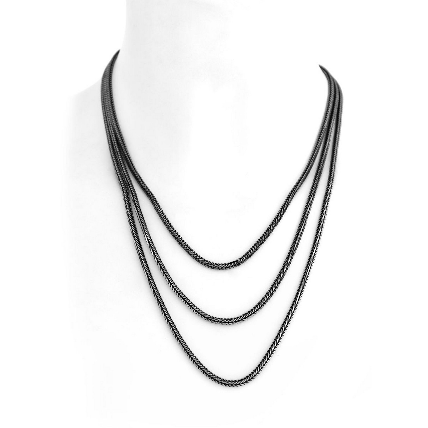Splendente argento brunito 925 risalta le linee della collana Girocollo Caos Apparente: tre giri di catena a spiga di grano creano un insieme di livelli in equilibrio. Un indissolubile legame tra le forme sinuose della catene e il simbolo iconico della spiga crea un accessorio che esalta il décolleté di chi lo indossa.