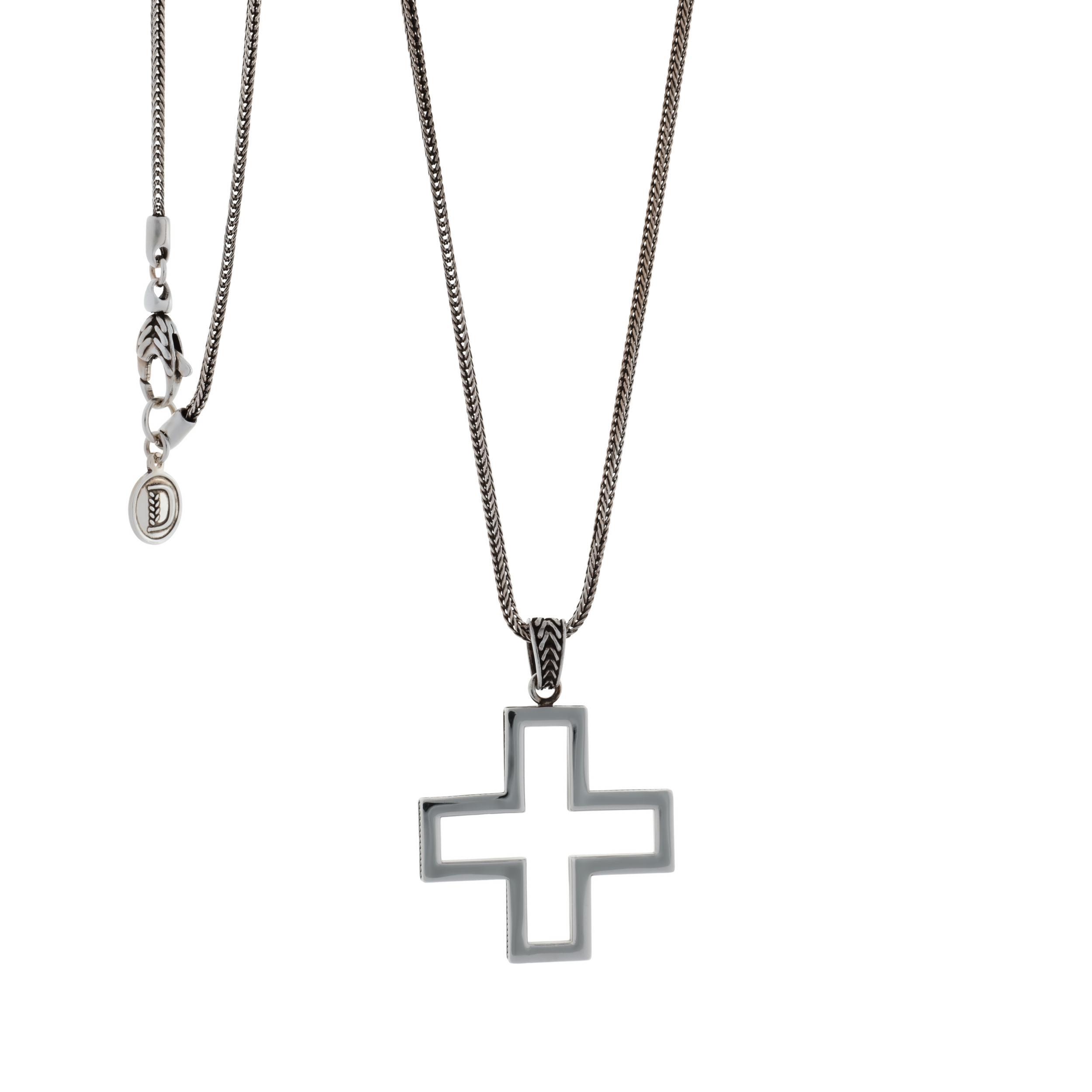 La collana con croce Greca in argento è formata da quattro bracci di uguale misura che si intersecano ad angolo retto. Tipica dell’arte bizantina la sua forma è contenuta in un quadrato e rappresenta gli aspetti dinamici del cielo, della terra, del tempo e dello spazio.
