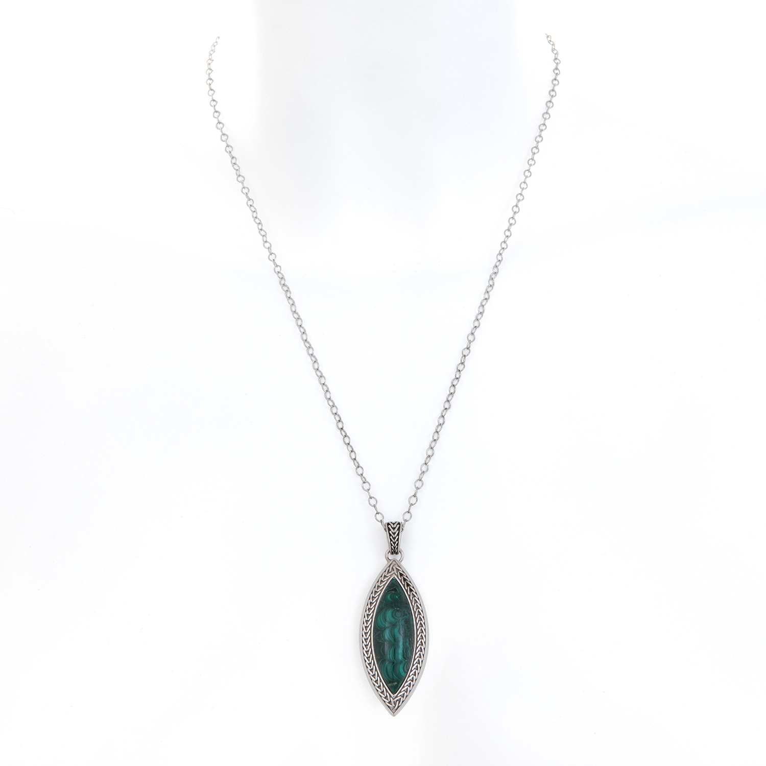 La collana Navette Malachite in argento racchiude la pietra di malachite simbolo di bellezza, speranza e rinascita: il minerale è custodito dall’argento brunito decorato con l’iconico motivo a spiga di grano, simbolo indissolubile dell’operosità, l’abbondanza e la speranza per il futuro. Il ciondolo richiama la geometria del diamante, una figura ovale e molto allungata.