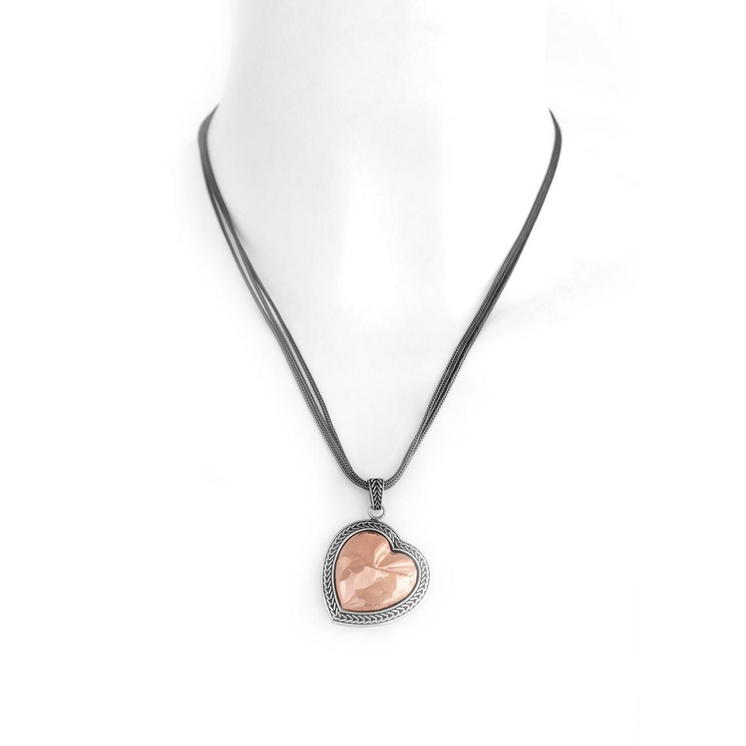 La collana Cuore d’Oro in argento brunito racchiude nella forma a cuore il desiderio e il sentimento dell’amore: l’oro rosa è custodito dall’argento brunito decorato con l’iconico motivo a spiga di grano, simbolo indissolubile dell’operosità, l’abbondanza e la speranza per il futuro. La collana pendente è formata da una triade di catene a spiga di grano chiuse all’estremità con chiusura a moschettone.