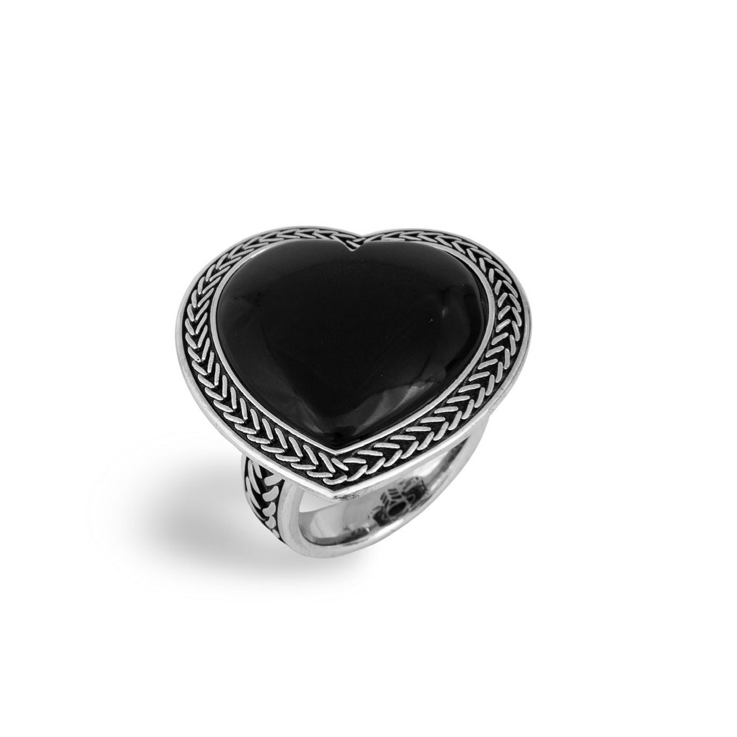 L’Anello Cuore Onice in argento 925 brunito e onice racchiude nella forma a cuore il desiderio e il sentimento dell’amore: l’onice è custodito dall’argento brunito decorato con l’iconico motivo a spiga di grano, simbolo della collezione Tesoro.