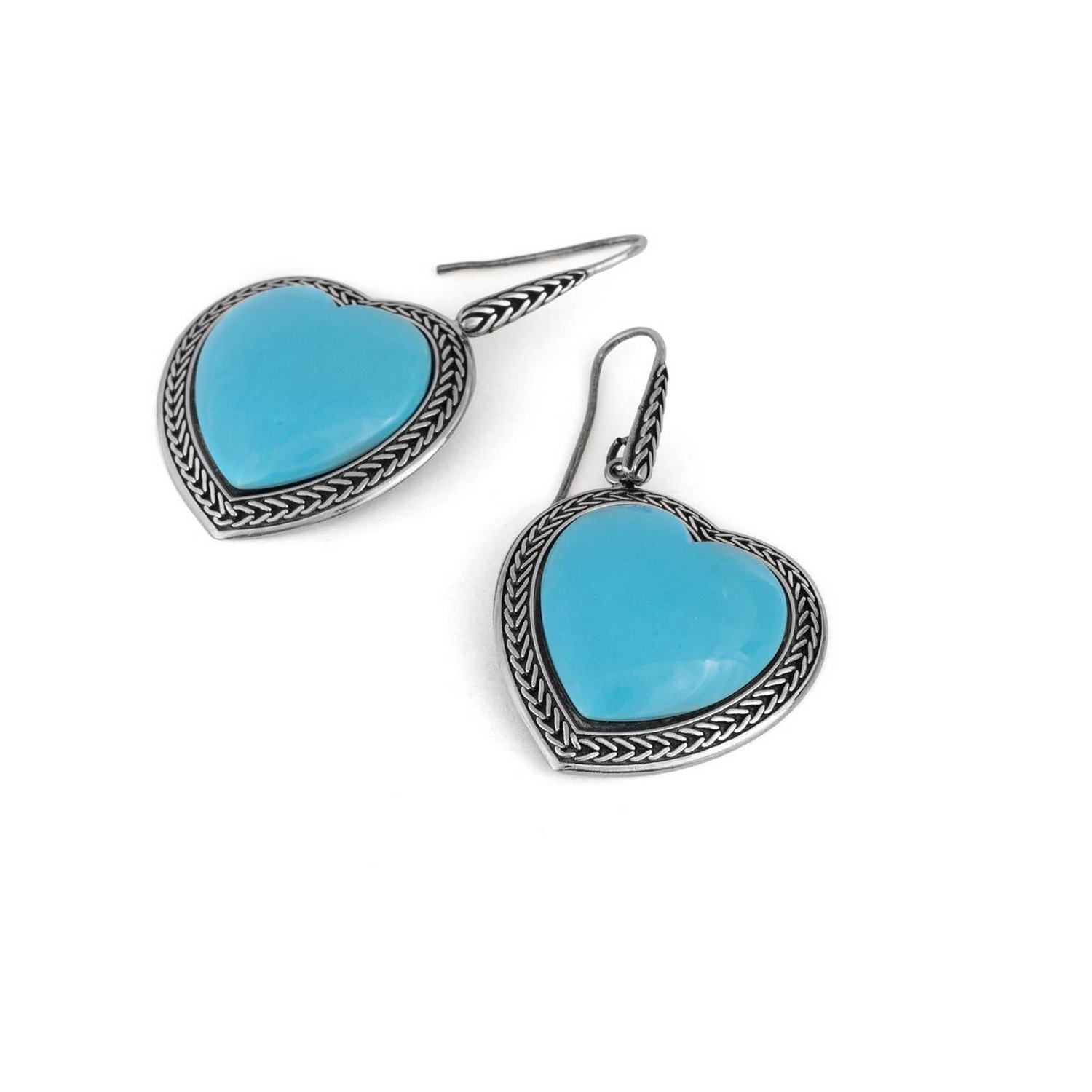 Gli orecchini pendenti Cuore turchese in argento brunito racchiudono nella loro forma a cuore il desiderio e il sentimento dell’amore: la pasta di turchese è custodita dall’argento brunito decorato con l’iconico motivo a spiga di grano, simbolo della collezione Tesoro. La chiusura a monachella permette ai pendenti oscillazioni morbide e movimenti liberi, come spighe di grano percosse dal dolce vento estivo.