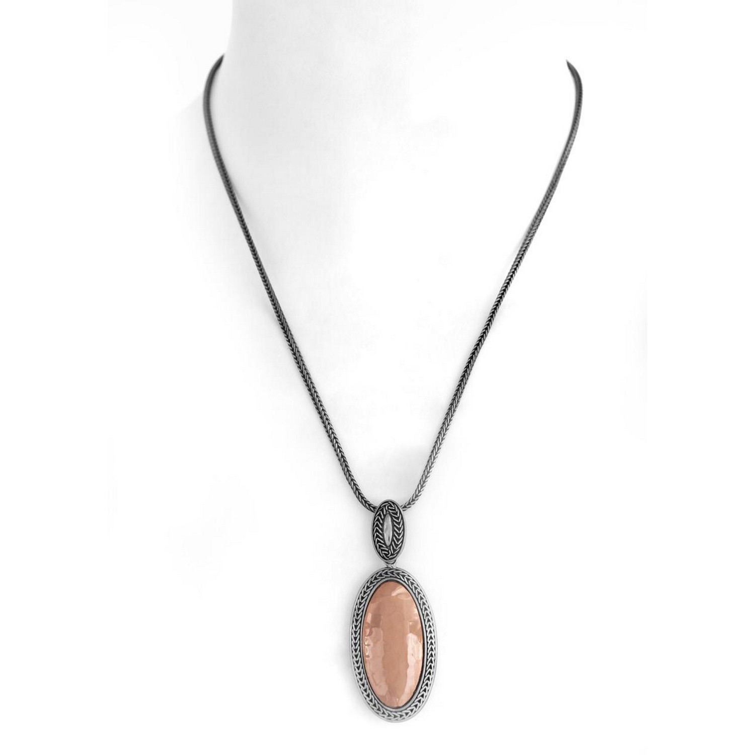 La collana Dolcezza Aurea in argento 925 brunito e oro rosa racchiude nella figura ovale la forma del chicco di grano: l’oro rosa è custodito dall’argento brunito decorato con l’iconico motivo a spiga di grano, simbolo indissolubile dell’operosità, l’abbondanza e la speranza per il futuro. La collana pendente è formata da una catena a spiga di grano chiusa all’estremità con chiusura a moschettone.