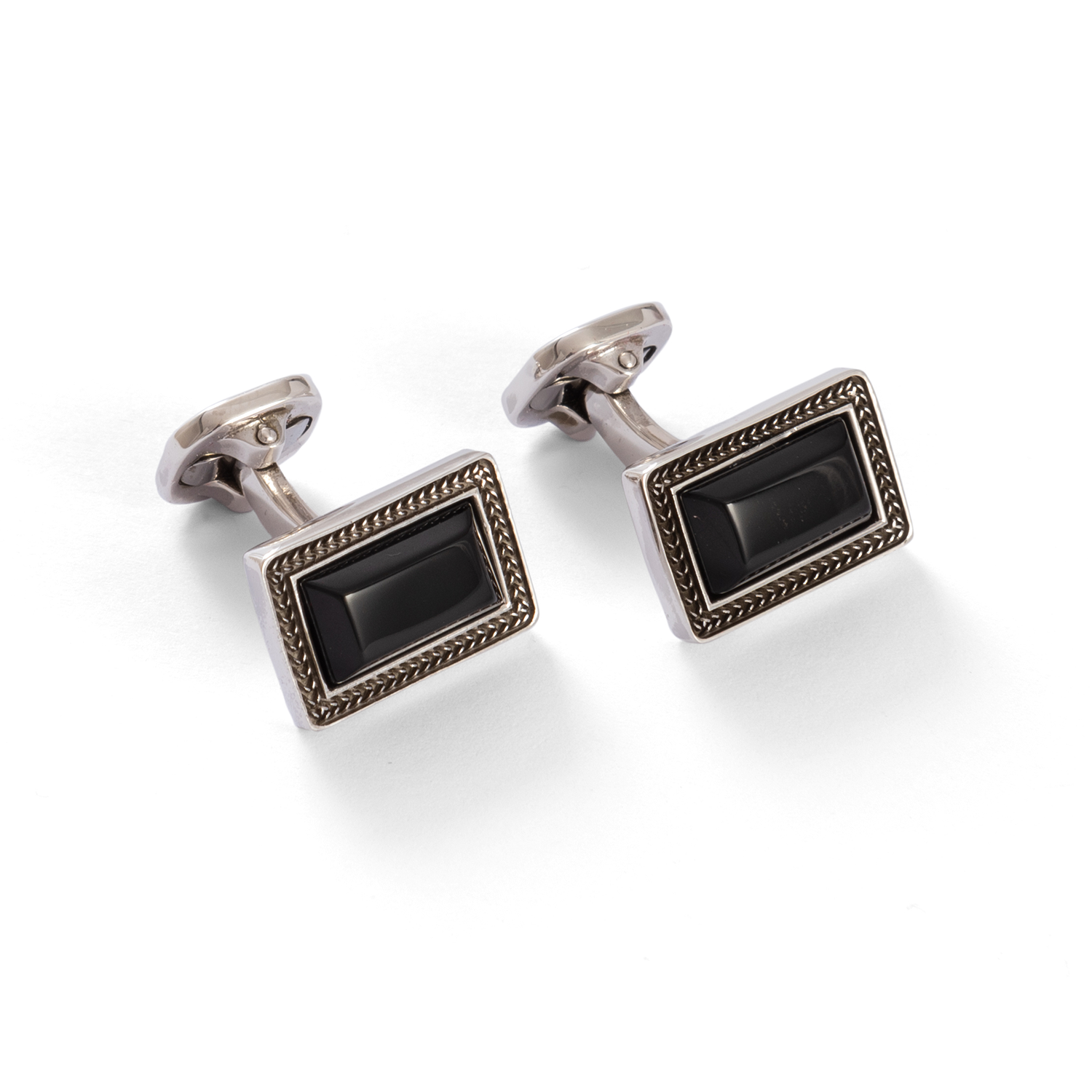 I gemelli Tratto d’Onice in argento traggono ispirazione dagli anelli indossati anticamente dai membri di nobili casati e famiglie. La pietra d’onice nera, incastonata al centro di un giro di spighe di grano, si erge risplendendo in tutta la sua regale eleganza.