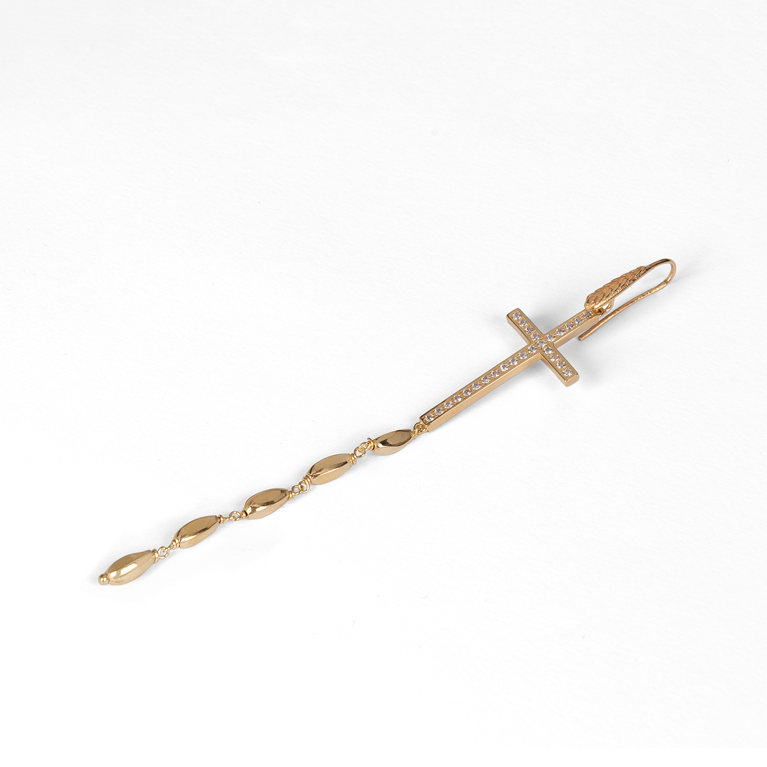 L’orecchino Chicco Spirituale Dorato è formato da una serie di chicchi argentati, quest’ultimi sono arricchiti da zirconi posizionati su una croce in argento decorata con l’iconico motivo a spiga di grano, simbolo indissolubile dell’operosità, abbondanza e la speranza per il futuro.