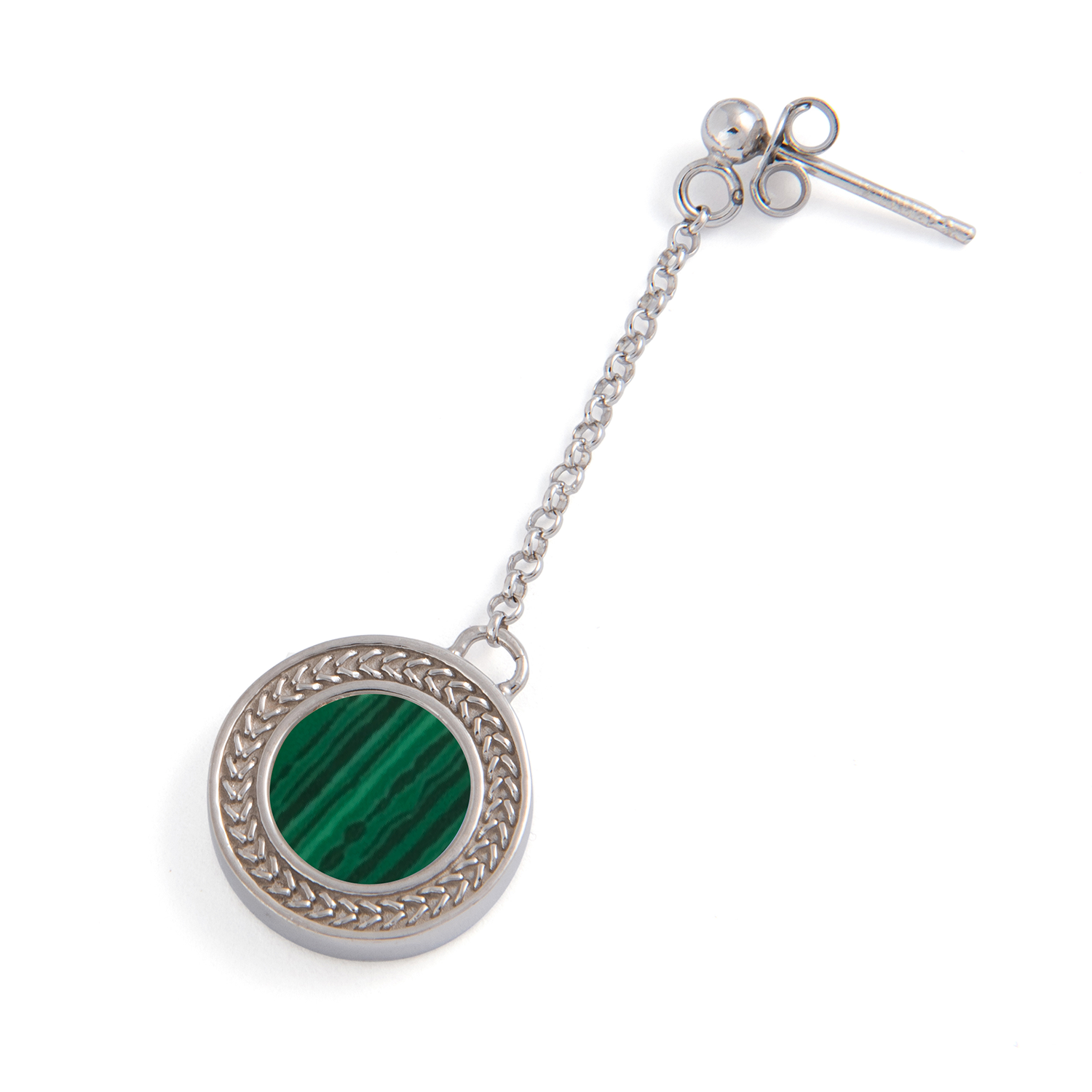 L’orecchino Doppia Bellezza in argento racchiude la pietra di malachite simbolo di bellezza, speranza e rinascita: il minerale è custodito dall’argento brunito decorato con l’iconico motivo a spiga di grano, simbolo indissolubile dell’operosità, l’abbondanza e la speranza per il futuro.