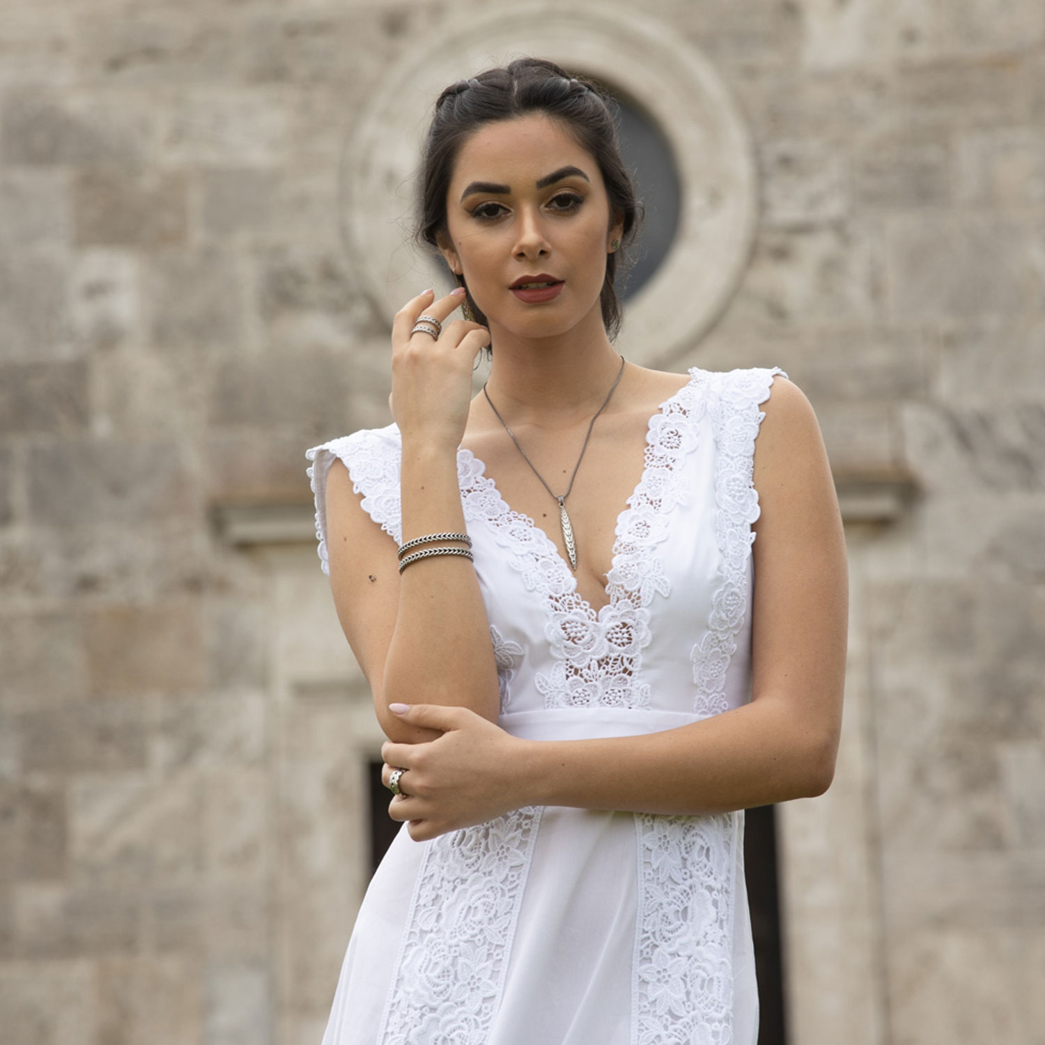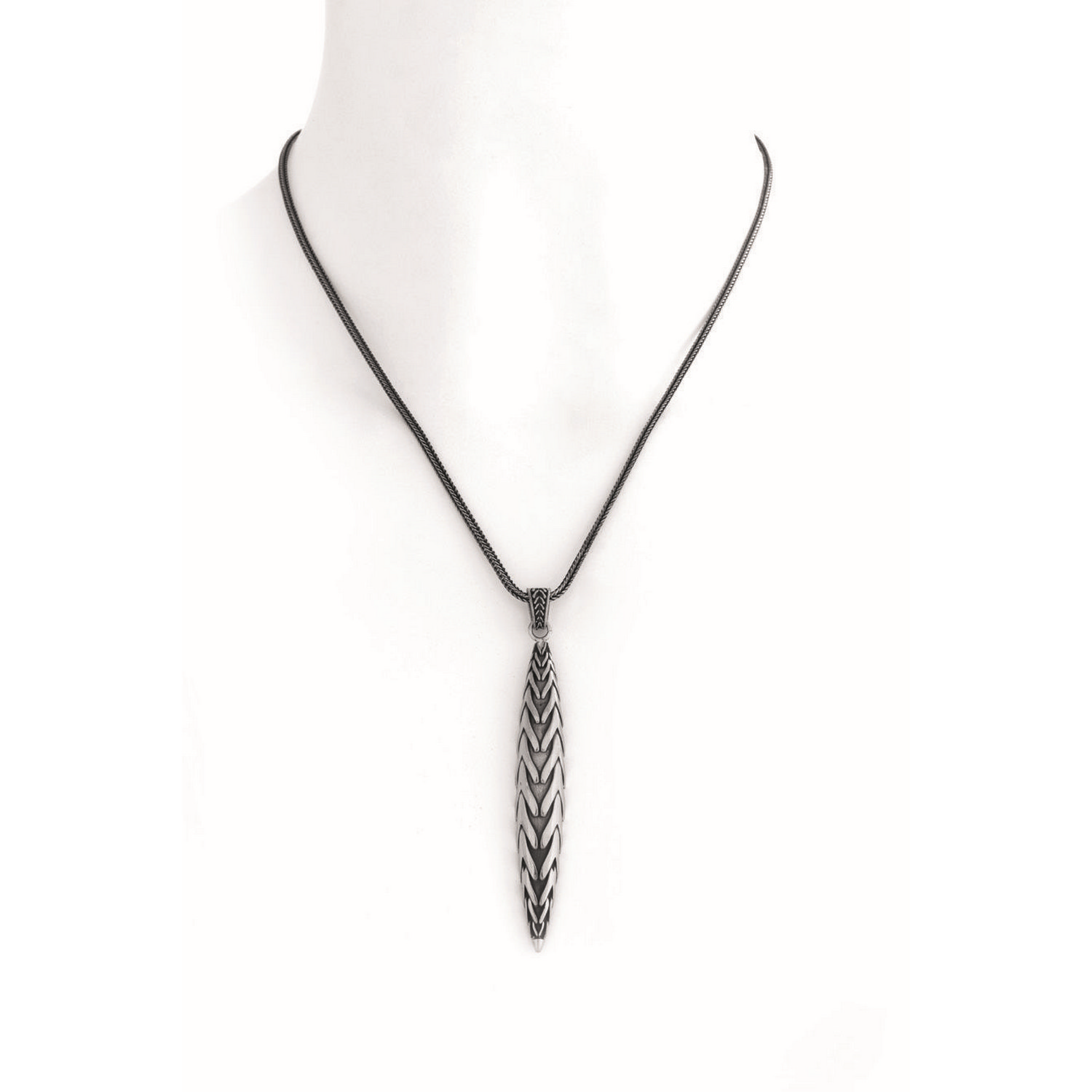 La collana Spiga in argento 925 brunito custodisce nel ciondolo il simbolo della Linea: la spiga di grano, simbolo indissolubile dell’operosità, dell’abbondanza e della speranza per il futuro. Il pendente è unito alla collana grazie ad un anello con motivo a spighe di grano. La collana pendente è formata da una catena chiusa all’estremità con chiusura a moschettone.